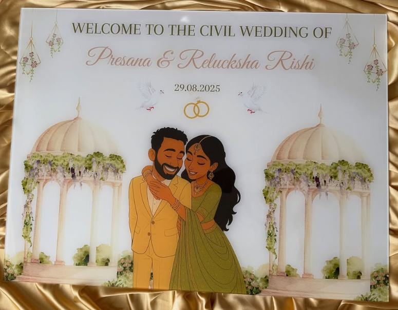 A white and gold easel is also available for rent and can be added as an optional extra to your order. For rental options please e-mail mayil.creations.info@gmail.com.