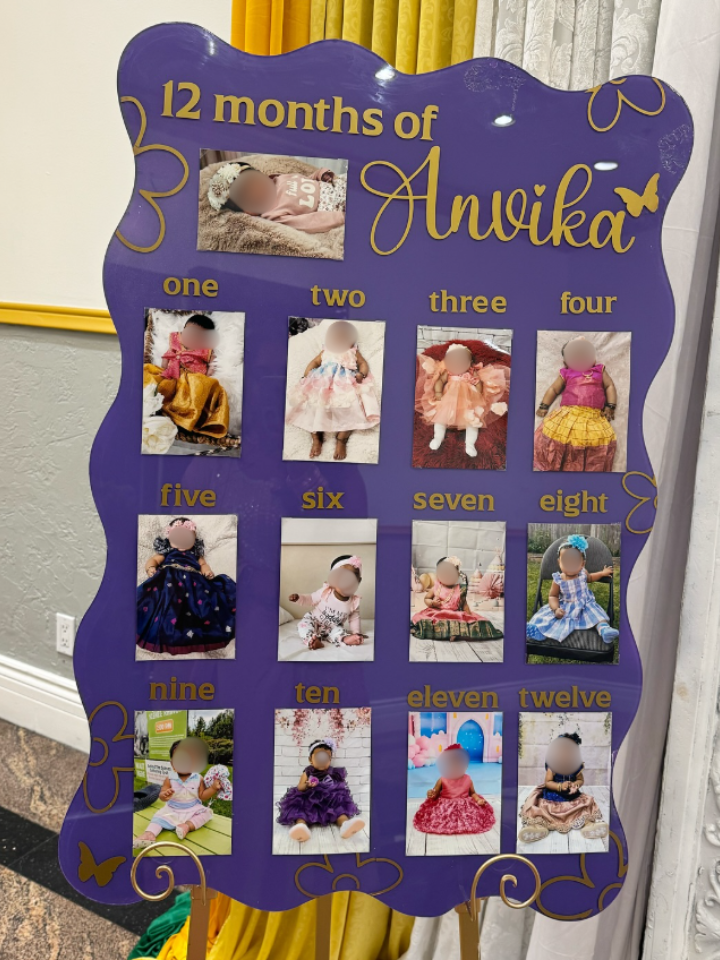 The photos are printed separately and attached to the acrylic, making them removable and reusable for other keepsakes or memory projects later on. The entire design is fully customized to match the theme of the first birthday, creating a cohesive and personalized display. Both the color of the wavy acrylic sheet and the vinyl details can be customized to your preference.