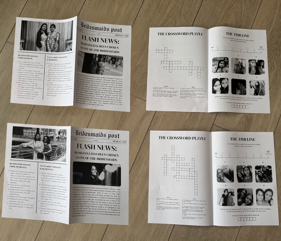 A personalized newspaper designed to propose to your bridesmaids or maid of honour in a timeless and creative way. This unique keepsake can be used for multiple occasions, such as pre shoot or a small get-together where you share your exciting news with family and friends.