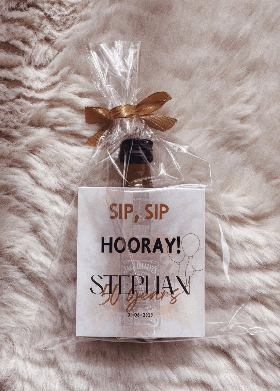 Add a refined and memorable touch to your celebration with this personalized mini whiskey return gift, featuring a 5cl Jack Daniel’s bottle elegantly wrapped with a custom-designed folded label.